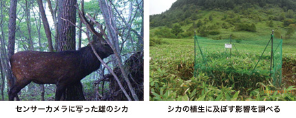 分布を拡大するシカや外来種のアライグマの動向を調査し、生態系への影響を未然に防ぐため、対応策を提唱するとともに、私たち自身も対策に力を注いでいます。
